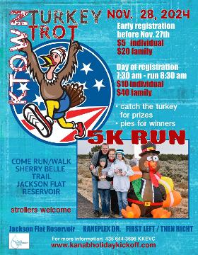 Start your Thanksgiving morning with the K-Town Turkey Trot 5K fun run. Meet us out at Jackson Flat Reservoir 2 miles South of Kanab. The Turkey Trot will take place on the Sherry Belle Trail that encompasses 3 miles of beautiful Jackson Flat Reservoir.